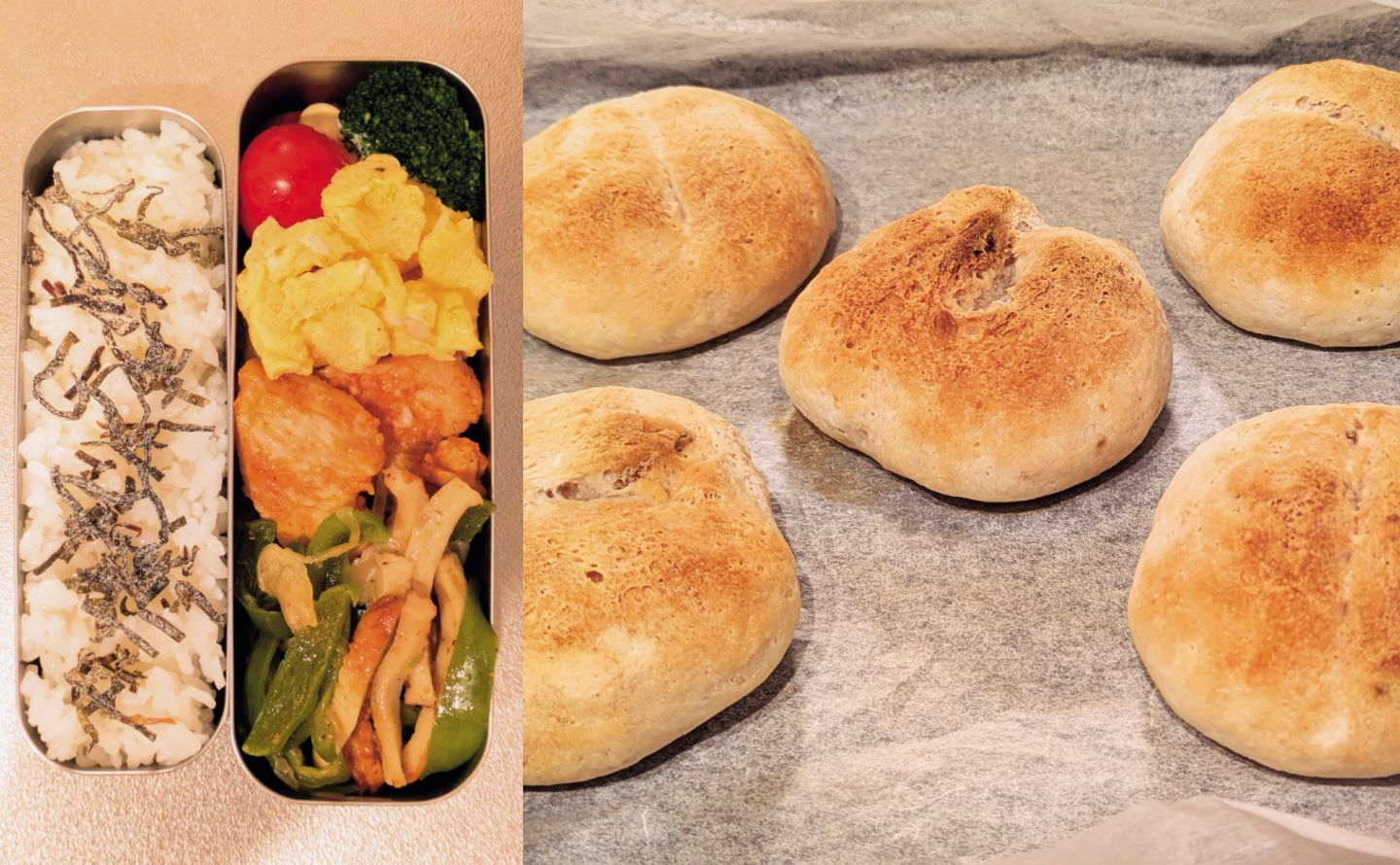 1週間分の弁当のおかずと、朝食用のパンを作っています。メンテに来てから弁当を持参し始め、最初は冷凍食品のお惣菜を詰めるだけでしたが、それに飽きて自分で作るようになりました。料理の先生は、もっぱらYouTubeです(パンについては右ページで詳しく…)。